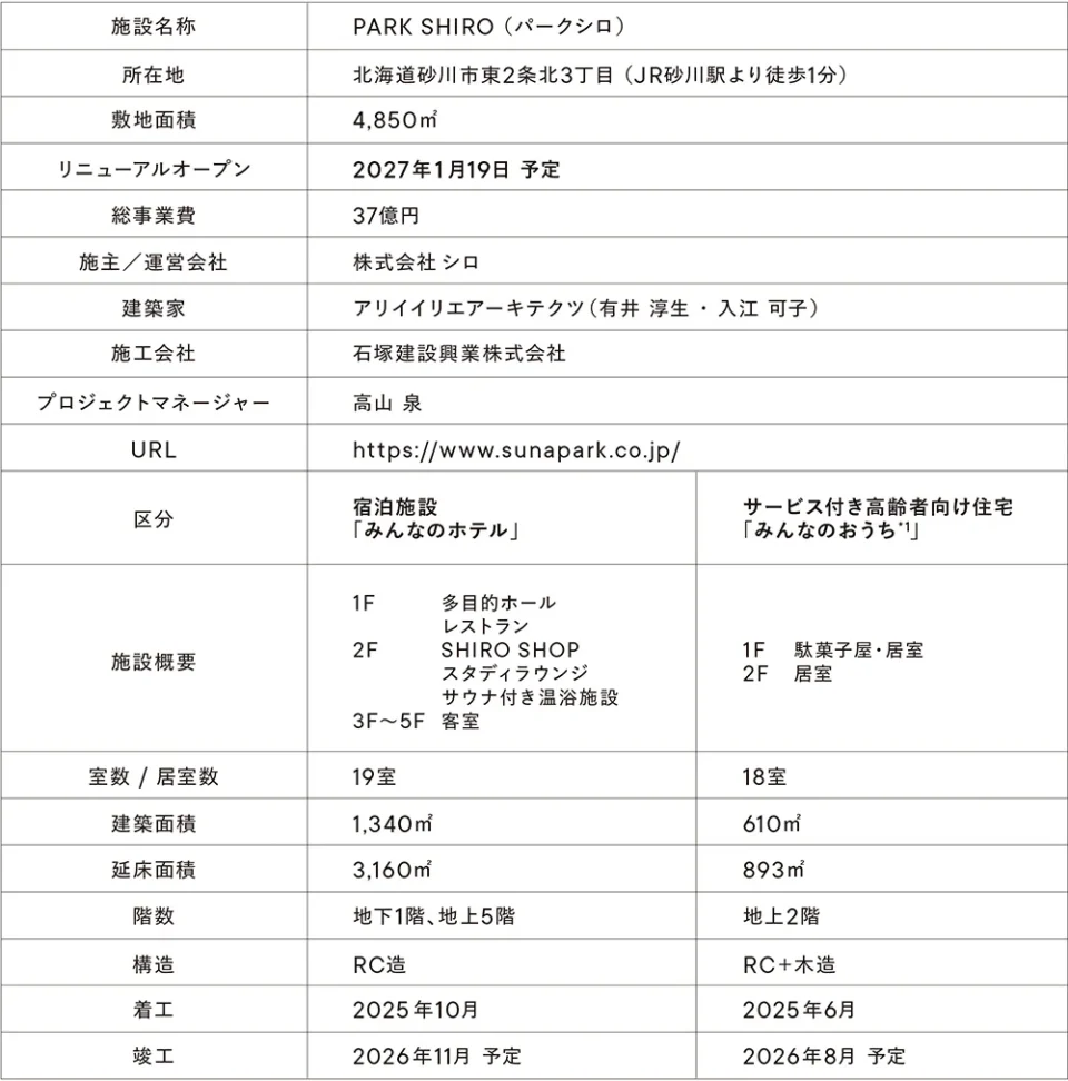 『PARK SHIRO』は宿泊施設「みんなのホテル」と、サービス付き高齢者向け住宅「みんなのおうち*」で構成され、ブランド初となる“セカンドハンド”をテーマとした新しいかたちのショップも併設します。「みんなのホテル」には5タイプ19室のほか、 温浴施設やレストラン、多目的ホールを計画。サービス付き高齢者向け住宅「みんなのおうち*」には、敷地内に駄菓子屋をオープンするなど、それぞれの場を開き、訪れる人にとっても、暮らす人にとっても、日常の居場所になることを目指します。